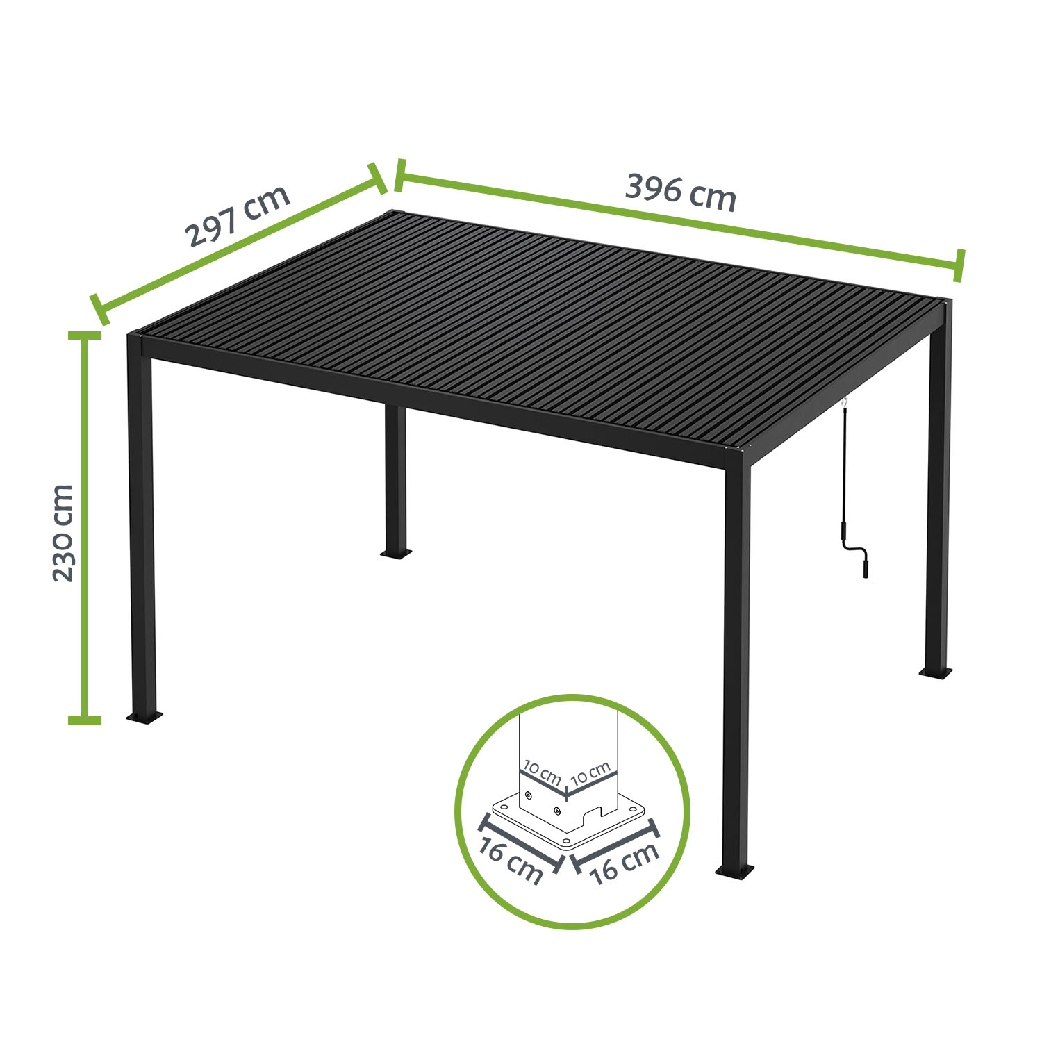 Die freistehende Pergola überzeugt mit einem verstellbaren Lamellendach aus stabilem Stahl. Die Handkurbel sorgt im Handumdrehen für den gewünschten Mix aus Schatten, Sonne und frischer Luft. Das robuste, rostfreie Material ist pflegeleicht und sorgt für eine lange Haltbarkeit.