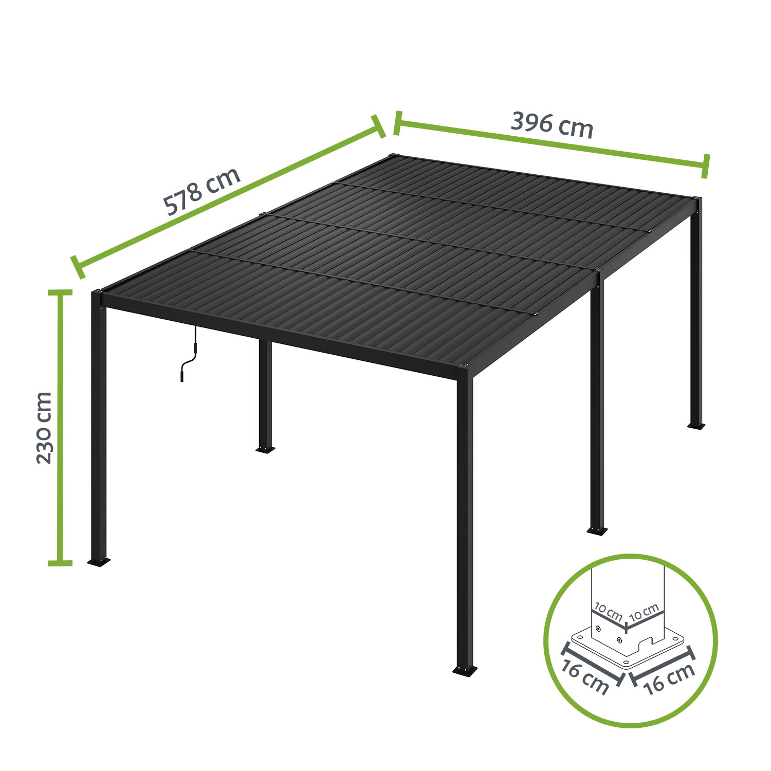 Nutzung als Carport: Die Pergola ZEUS eignet sich als geschützter Stellplatz für Fahrzeuge. Bitte vor dem Aufbau die Fahrzeugmaße (Breite, Höhe, Länge) prüfen. Je nach Bundesland oder Kommune kann für die Nutzung als Carport eine Baugenehmigung erforderlich sein – bitte ggf. beim zuständigen Bauamt informieren.