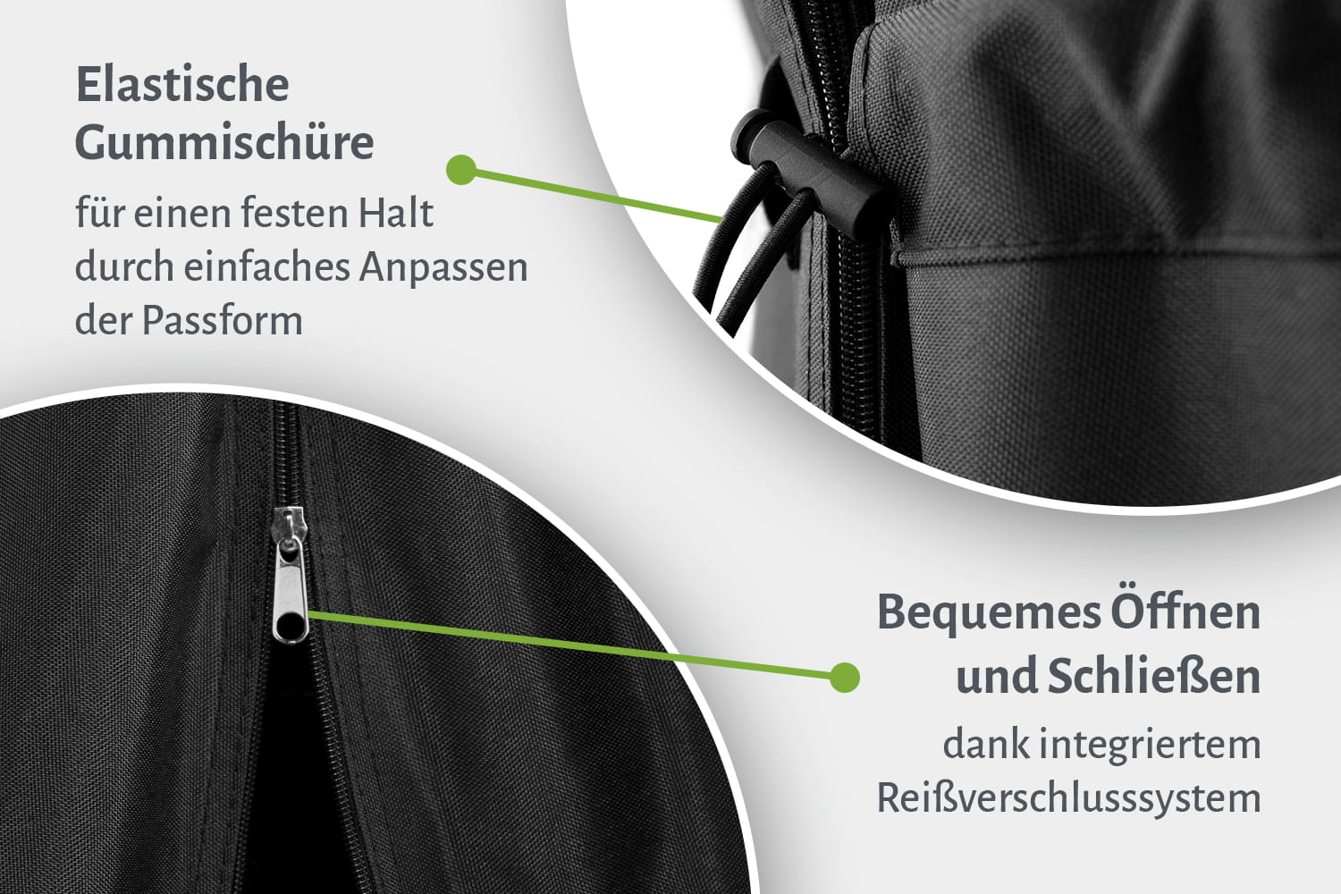 Die Schutzhüllen aus wasserabweisendem Polyester bieten sicheren Schutz vor Wind, Regen und Schmutz. Ob als Abdeckung für Gartenmöbel, deinen Grill, Sonnenschirm oder Terrassenheizer - die Hauben in zahlreichen Größen sind individuell nach eigenen Belieben einsetzbar. Die integrierten Reißverschlüsse und Gummischnüre ermöglichen eine besonders unkomplizierte Handhabung und einen sicheren Halt der Schutzhüllen.